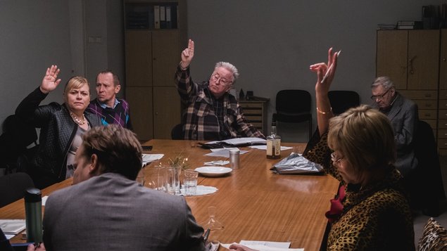 Pani Záhradková (Tereza Ramba) s manželom (Vojta Kotek) romanticky túžia spoločnými silami dom zachrániť a novomanželia Bernáškovci (Jiří Černý, Mária Sawa) sa nadšene k nápadu pripájajú. Pani Roubíčková (Klára Melíšková) pedantne priebeh schôdze kontroluje a zaznamenáva, pani Horvátová (Dagmar Havlová) všetko iniciatívne komentuje. Naivný pán Švec (David Novotný) na schôdzi zastupuje svoju mamičku. Pani Procházková (Pavla Tomicová), zastupovaná pánom Novákom (Ondřej Malý), hľadá spôsoby ako by svoj majetok zveľadila a pán Nitriansky (Andrej Polák) zase veľmi túži po podkroví. Pan Kubát (Jiří Lábus) dôsledne sabotuje každé rozhodnutie a v úzadí číhajú ešte bratia Čermákovci (Kryštof Hádek a Stanislav Majer).